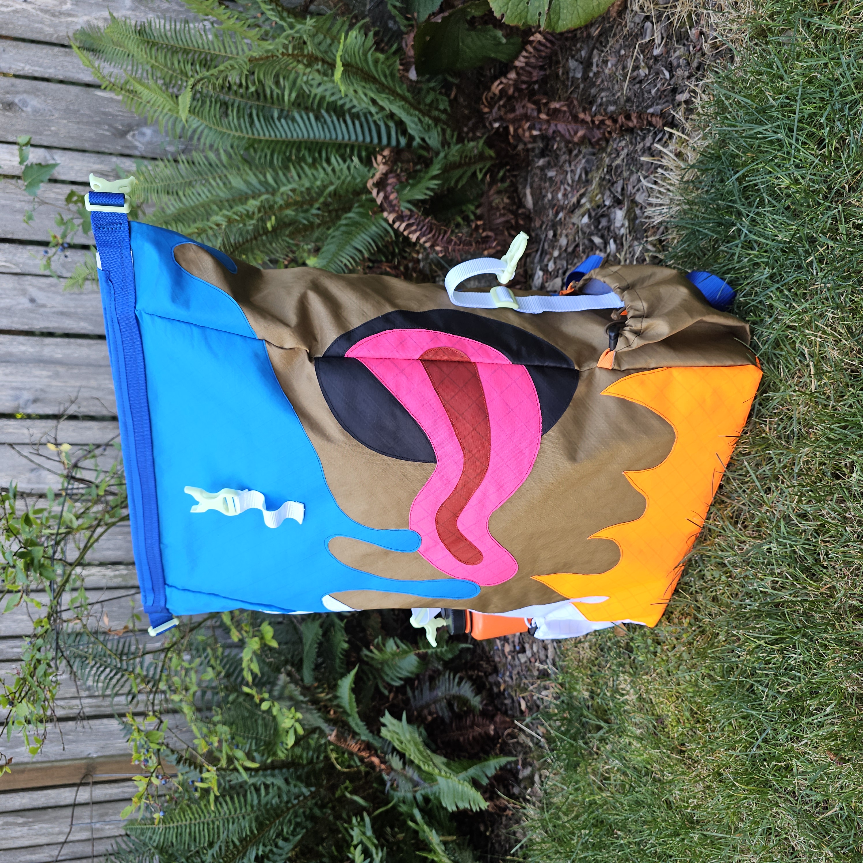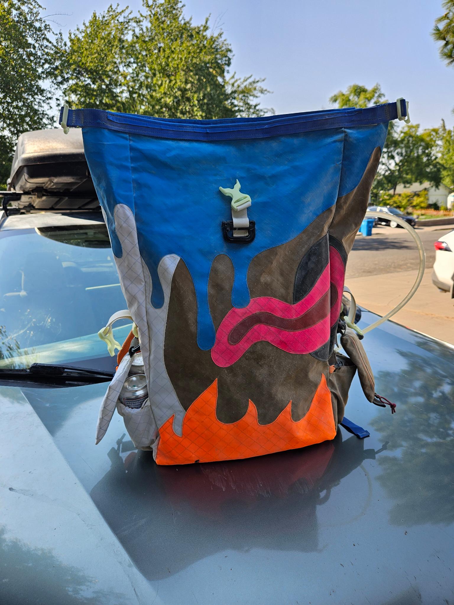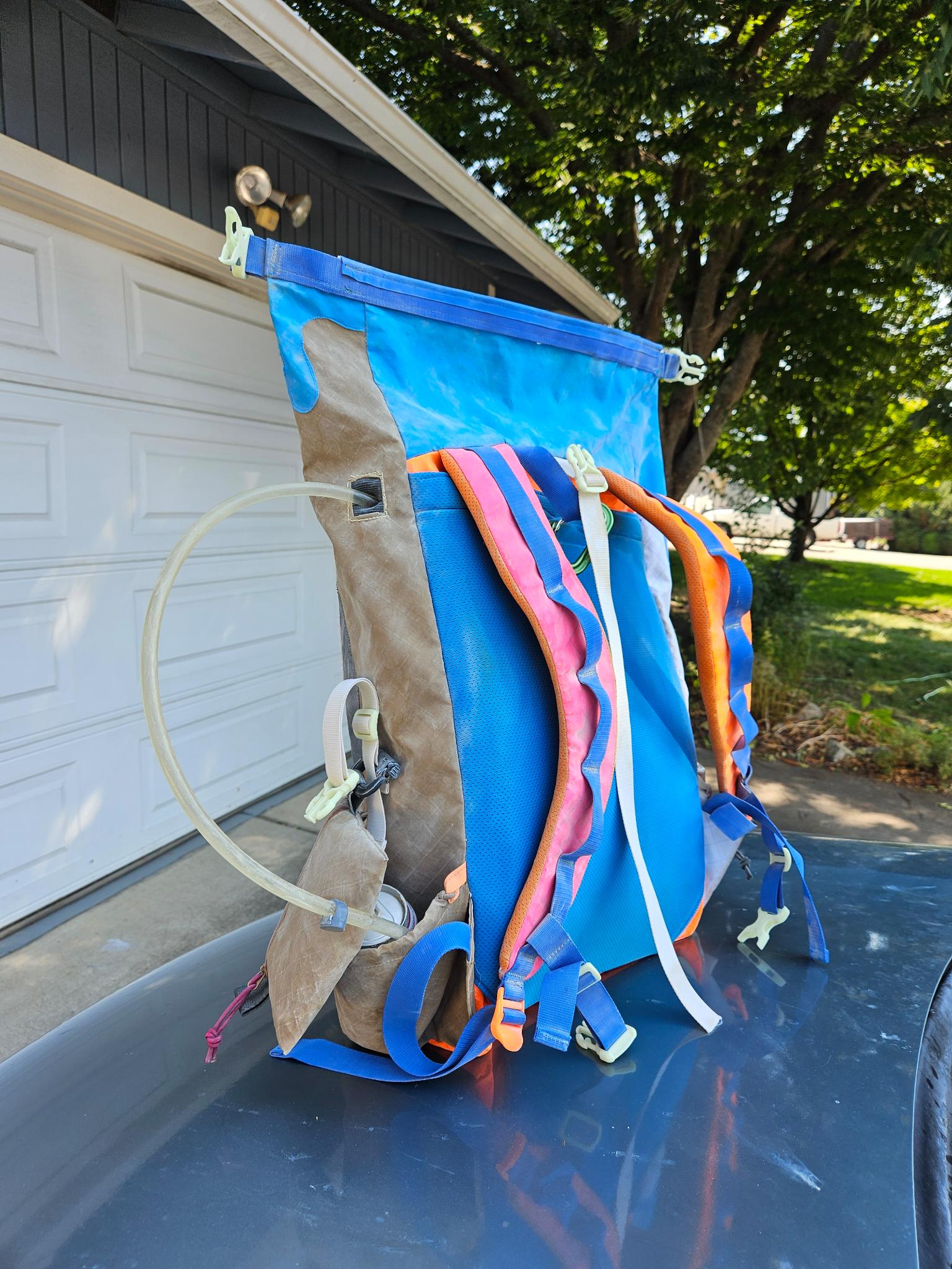A friend needed a 35-liter backpack for Burning Man in two weeks. His pack was in the shop, and he wanted something "as crazy as possible" that could carry water while keeping desert dust out. Challenge accepted.