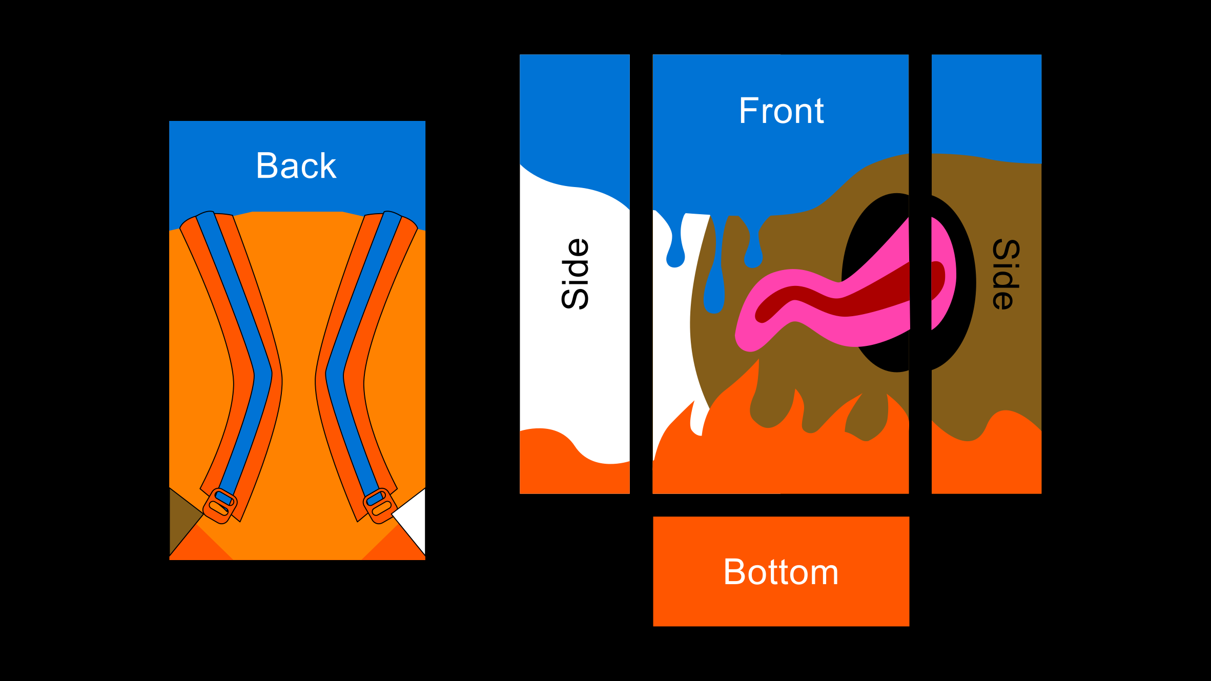 Instead of winging it, I designed a lowbrow-art concept: a tongue drinking water from the sky while the ground burns below. Mocked it up in Inkscape, mapped it in Blender, animated a 360° turntable with cinching simulation. His response? "Fuckin' sick, bro!"
