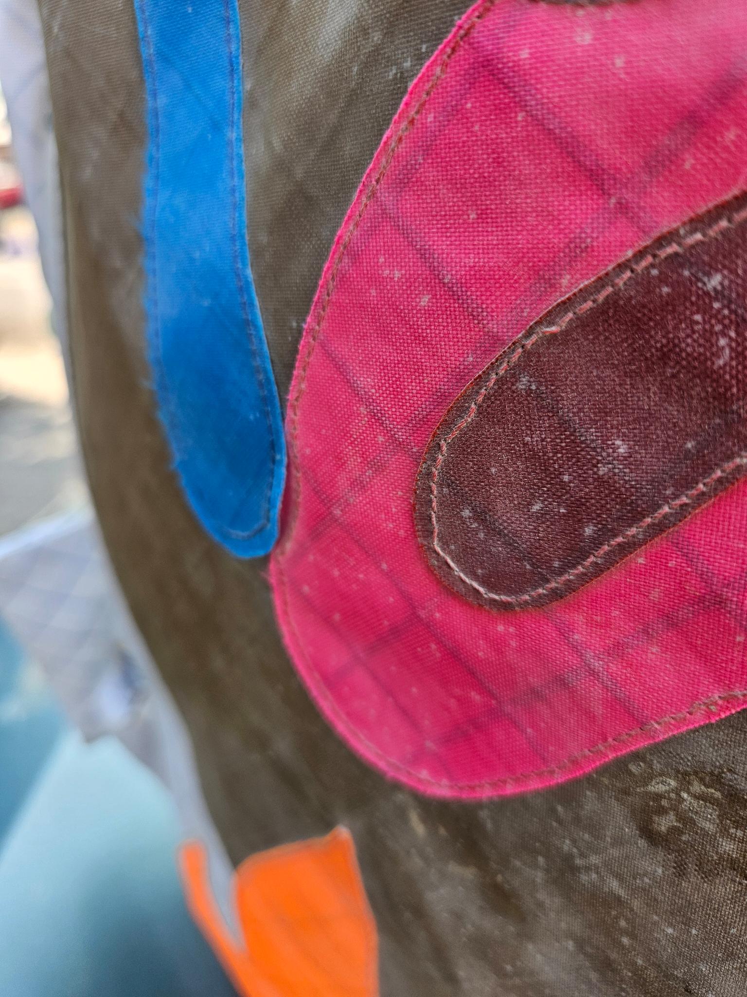 The tongue, water droplets, flames, and desert floor are all hand-sewn appliqué. Built-in Camelbak pocket with a side port for the water tube means constant hydration without opening the roll-top. Every piece besides the straps was a custom pattern, no templates—delivered on time.
